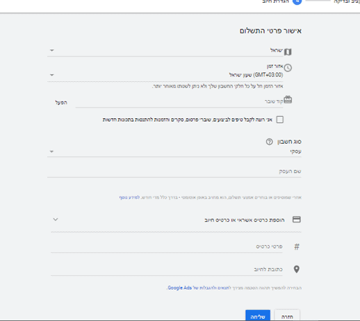 לאחר שסיימתם לעבור על הגדרות המודעה, כעת יהיה עליכם למלא את פרטי התשלום טרם תישלח המודעה לבדיקה ותפורסם בגוגל. שימו לב, ישנם סוגי אשראי אשר אינם מתקבלים ע"י גוגל. בעת לחיצה על כפתור "שליחה", אנא בדקו כי כל הפרטים תקינים ושהמודעה