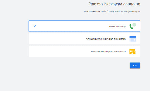 בשלב הבא תתבקשו לבחור את מטרתו העיקרית של הפרסום בגוגל אדוורדס:
