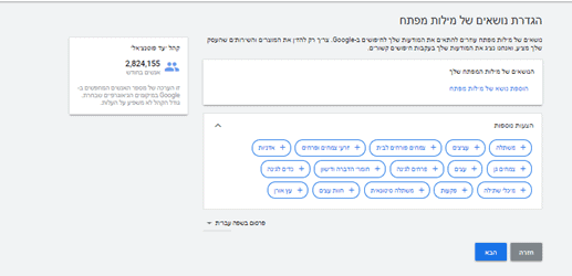 נושאים אלו יעזרו ל-Google Ads להתאים את המודעה לחיפושים שיבצעו הלקוחות הפוטנציאליים שלכם. חשוב לציין כי המודעות יוצגו בהתאם לחיפושים הקשורים למילות המפתח שהגדרתם, על כן יש להקדיש תשומת לב רבה לשלב זה.
