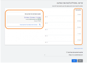כאן, תוכלו לעבור, לבדוק ולוודא אחר הפעולות שביצעתם בכל השלבים הקודמים עד שלב זה. וודאו כי יעד הקמפיין הנו היעד שבחרתם, מילות המפתח