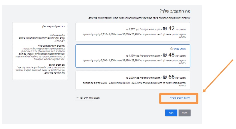 לאחר שסיימתם להגדיר את כותרות המודעה שלכם, יהיה עליכם לבחור את התקציב המתאים ביותר הן לעסק שלך והן לתוצאות הרצויות –